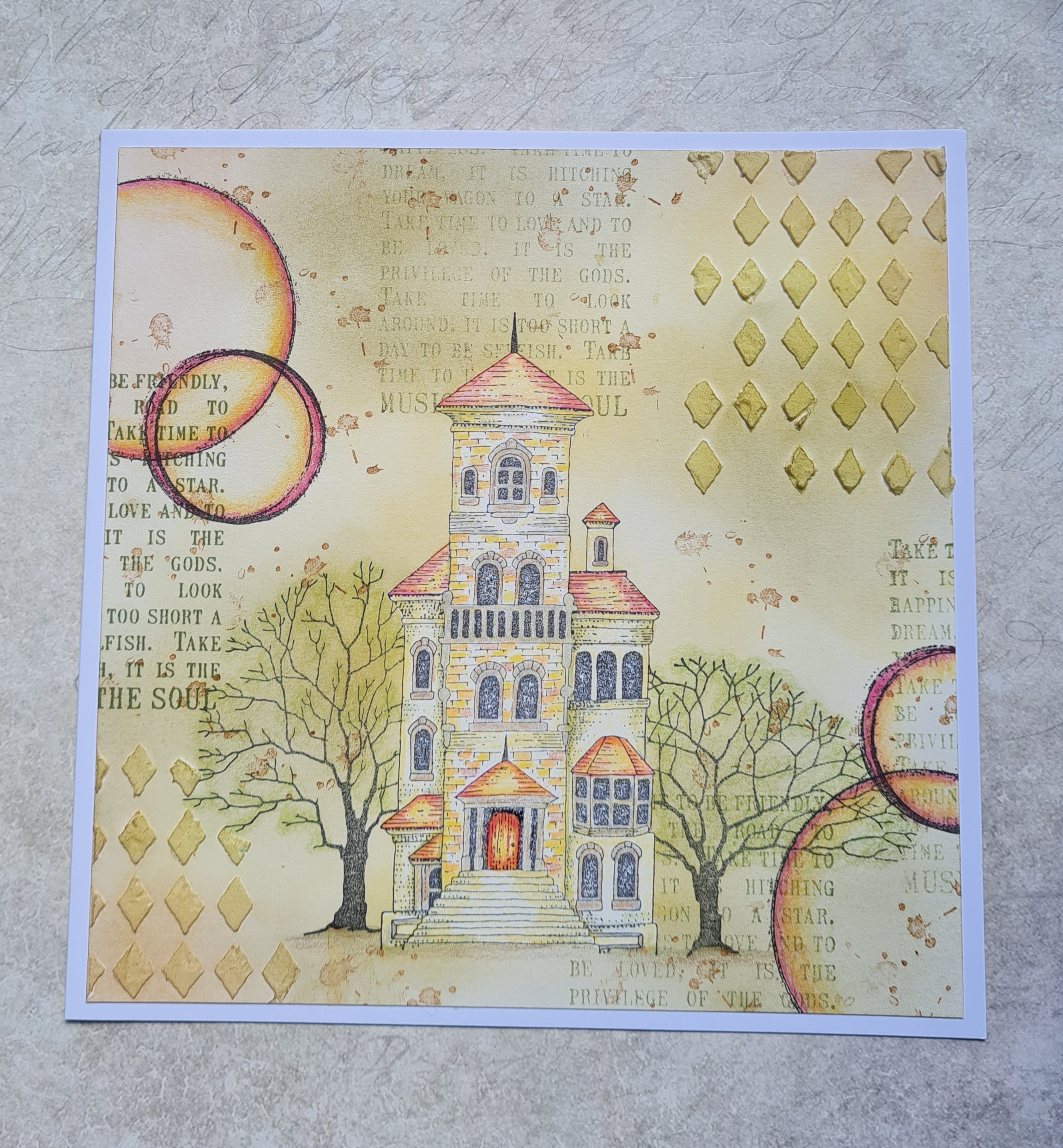 This one is the Heath Robinson House. I stamped the main image on a tag, coloured it with pencils, and used one of the sentiments to create a background over a gelli print.